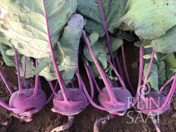 EHZ ReinSaat. Schnell wachsender, sehr aromatischer Treib- und Freilandkohlrabi für die ganze Freilandsaison. Mittelgroße, flachrunde, zarte Knollen von attraktiv blauvioletter Farbe und ausgezeichnetem Geschmack. Halb aufrechtes, mittelstark und mittellang gestieltes Laub. Gut frostbeständig und schossfest.