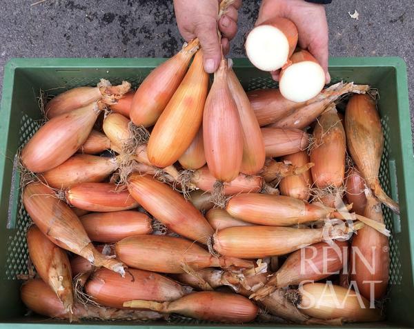 Beautiful, elongated onions with a golden-yellow skin and a very good, deliciously fresh, mild taste. Fruit length 14-17 cm, fruit weight approx. 150 g, diameter approx. 5 cm. Medium-late ripening variety with good storage life. Vegetation period: 130-135 days.
